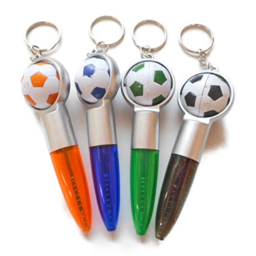 【グラシアス】サッカーボール付きミニボールペンはいかがでしょうか?オレンジ/黒/緑/青の4本セットでお得感があり予算500円以内で購入できます。インクの色は黒でキーホルダーにできますよ。おしゃれで可愛いデザインですしバッグなどに付けれるサイズ感ですし記念品におすすめです!