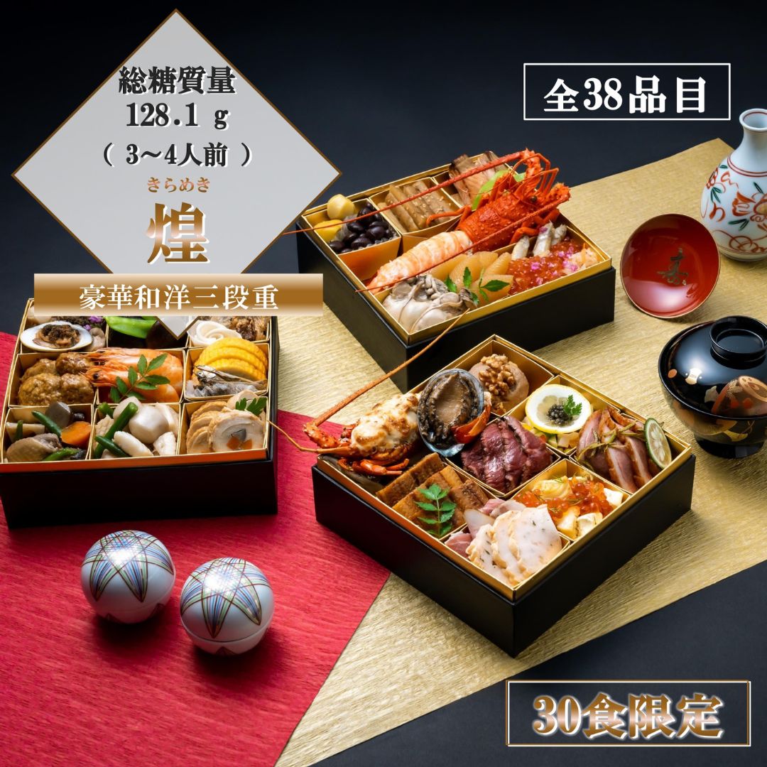 低糖質おせち三段重はいかがでしょうか。38品目3〜4人前あります。豪華和洋で、添加物不使用、白砂糖不使用なのでおすすめです。