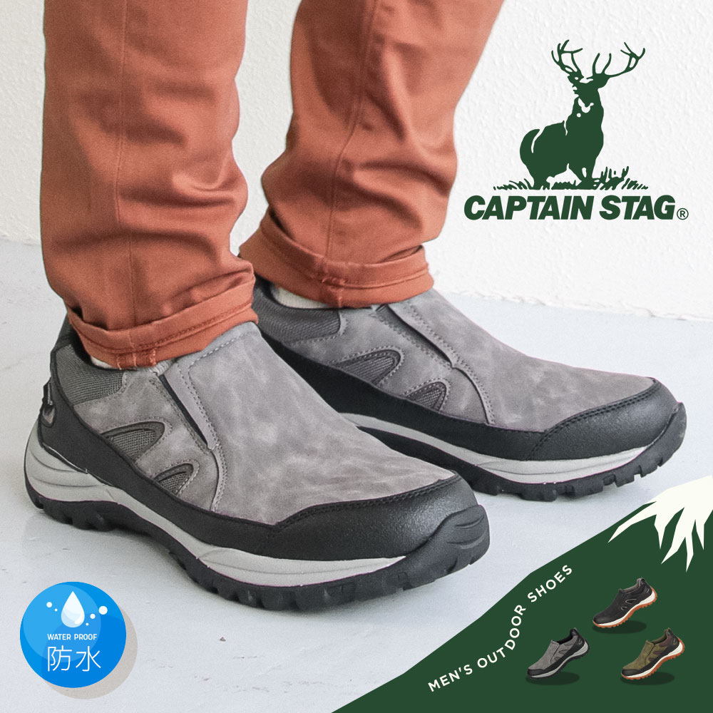キャプテンスタッグのモックシューズがおすすめです。防水性に優れており、サイドゴアで履きやすいです。アウトソールのグリップ力もよく、泥やコケの上でも滑らずに歩きやすいです。