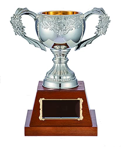 サイズ高さ190×口径65mmのシルバーのカップが付いたトロフィーはいかがですか。台座は樹脂製です。