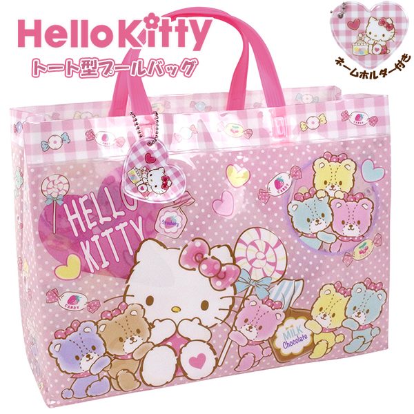 ペールトーンで可愛らしいハローキティのスイムバッグです。マチが広くとられていて嵩張りがちなタオルもしっかり仕舞えますね。