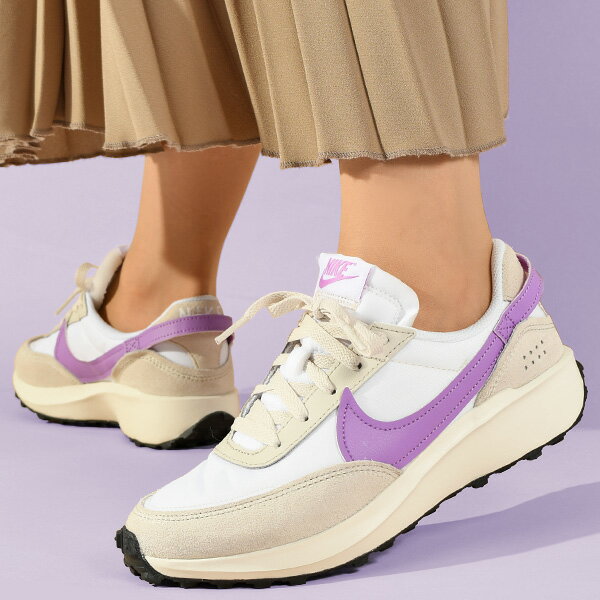 レディース向けのNIKE製のスニーカーでベージュとパープルのカラーが女性っぽくおしゃれに履きこなせます。