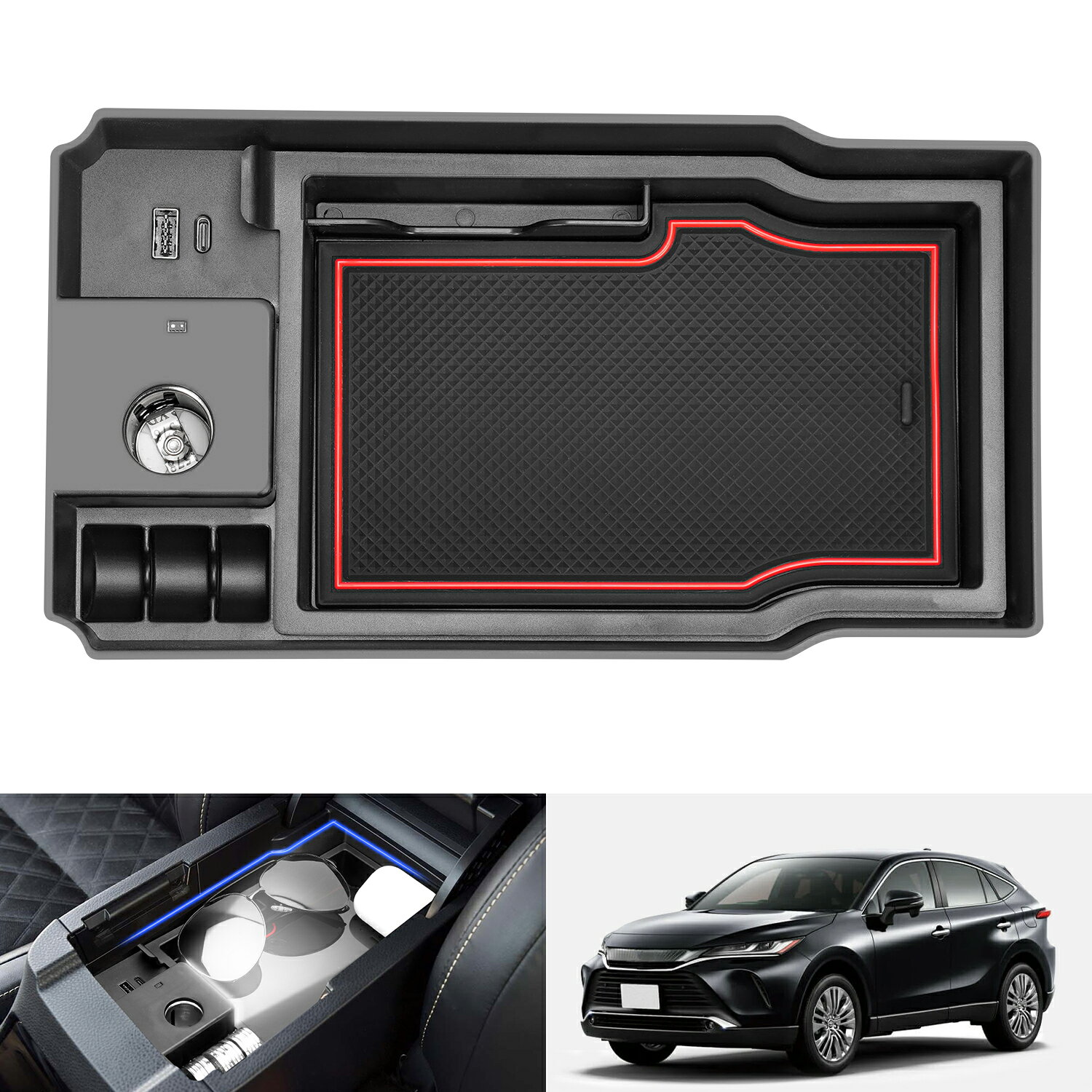 トヨタのハリアーに付けられるコンソールボックスです。とても高級感があり、LEDセンサーライト付きで、車内を素敵にドレスアップできます。USBポート付きで、スマホの充電ができます。