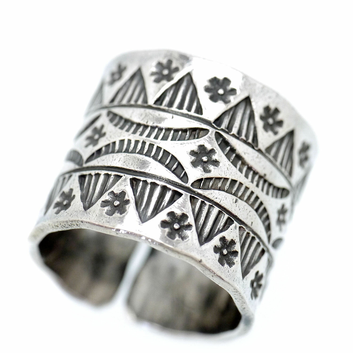 こちらのカレン族の伝統模様が施されたエスニックなデザインが格好良い太めで存在感抜群のリングはいかがでしょうか。シルバー925製なので劣化もしにくく長く愛用できますよ。オススメです。