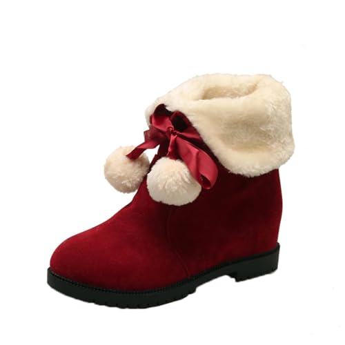 ミドル丈の真っ赤なスノーブーツはいかがでしょうか?大きなボンボンがお洒落ポイントです。靴底も完全なペタンコのフラットではなく少しだけ高さのついたローヒールが横から見て女性らしい足元のラインになると思います。内側は裏ボア付きでフワフワモコモコあったか!足先を冷えから守る冬の防寒対策にもなりますよ。アウトソールは雪道でもグリップがきく滑り止め付きで歩きやすいです。履き口はのばしても折り曲げてもOK!