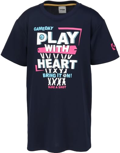 シューズブランドで人気のコンバースから出ている半袖ロングTシャツはいかがでしょうか?ジュニア向けのユニセックスです。ネイビー地にお洒落なローマ字が入っており文字の中の空間にバスケットボールの絵がさりげなく入っています。ピンクと水色のラインも可愛いので中学生の女の子に似合いそう!ポリエステルのメッシュニットが採用されており運動で汗をかいても吸汗速乾性がありサラサラで快適です。練習に集中できますよ!