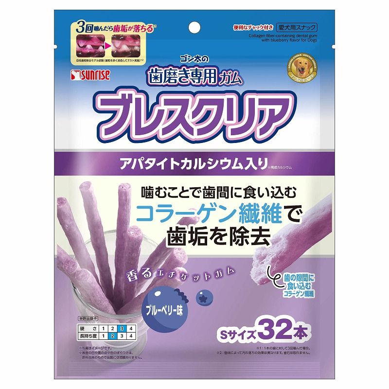 こちらのワンちゃん用おやつ歯磨きガムは如何でしょうか。細かなコラーゲン繊維が含有されていて、噛むことで歯の表面を磨いてくれます。カルシウムも入っており、口内を健康に保つことが出来ます。ブルーベリーの香りが爽やかでおすすめです。