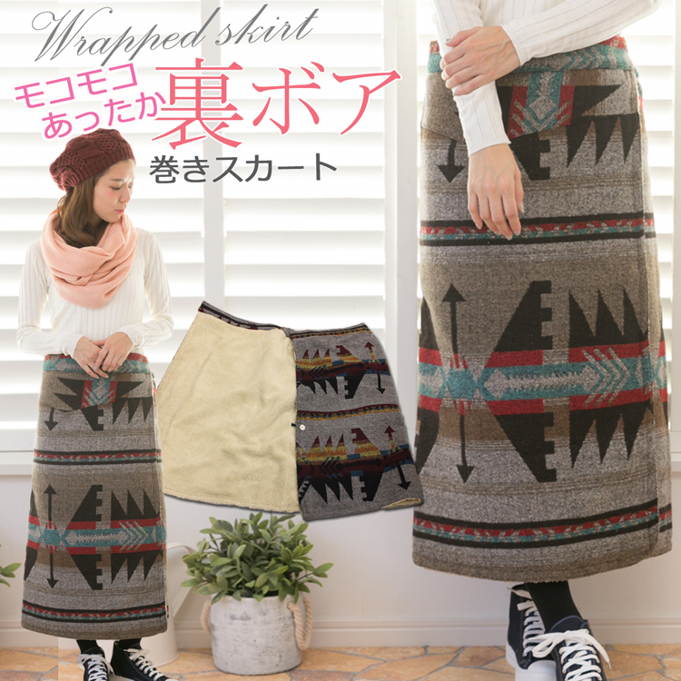 こちらのネイティブ柄がおしゃれなロング丈の巻きスカートはいかがでしょうか。裏ボアなので保温、防寒性が抜群でアウトドアなど様々なシーンで活躍してくれますよ。