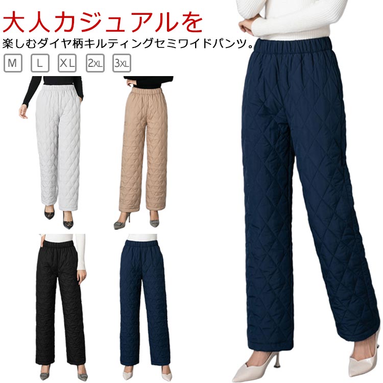 レディース向け寒い季節のアウトドアで着用できる防寒のキルティングパンツです。ダイヤ柄・ブラック/ホワイト/ネイビー/ベージュカラーのシンプルでオシャレなデザインになっており、ポリエステルの素材で中綿入りの軽くて防寒性のある暖かいワイドパンツです。コスト的にもお得感のあるものですので、良いのではないかと思います。