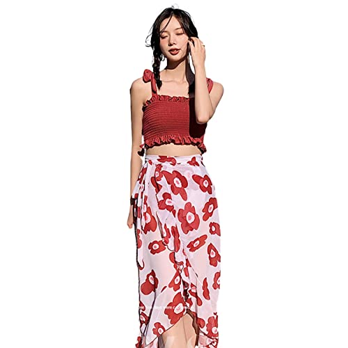 ビビットな赤色で若々しいイメージをのこしつつ、同系色のパレオが動きを出しながらしっかり体形を隠してくれます